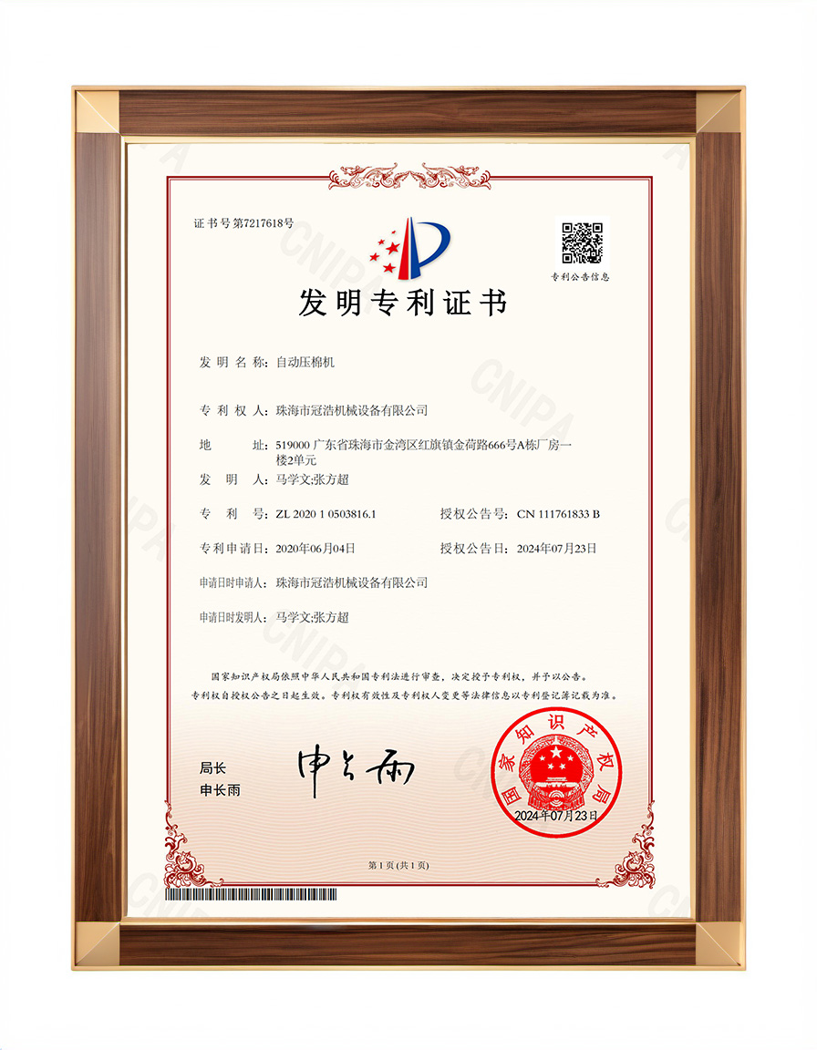 珠海冠浩成功獲得自動(dòng)壓棉機(jī)發(fā)明專利